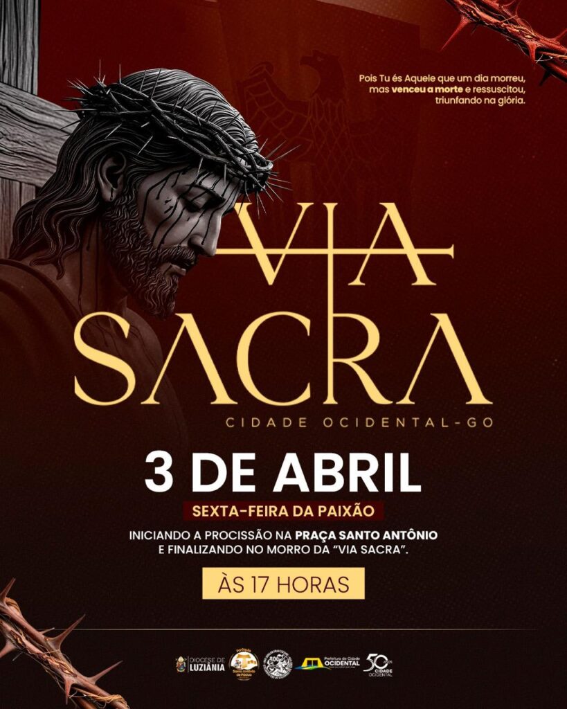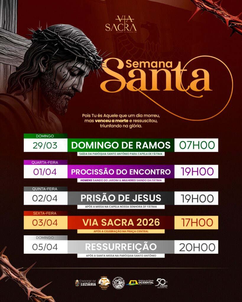 A Semana Santa em Cidade Ocidental será celebrada com fé e tradição, reafirmando, mais uma vez, o espírito que marca esse período tão significativo para os cristãos. A programação especial reúne momentos de oração, reflexão e devoção, recordando a paixão, morte e ressurreição de Jesus Cristo.